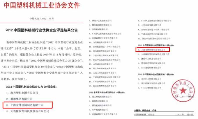 由中国塑料机械工业协会组织的“2012中国塑机行业优势企业排序工作”(参见中塑机协〔2012〕19号文),本着“公平、公正、自愿”的原则,经审核、评审和公示后,金纬公司入选“2012中国塑料挤出成型机行业5强企业”榜首。