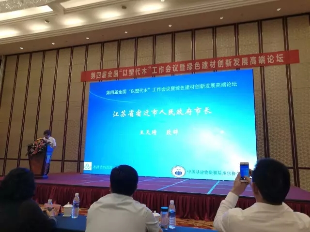 待一系列参观活动结束后,下午13点30时大会在运河金陵酒店运河厅正式开始。宿迁市人民政府王市长出席大会并致开幕辞,他对所有参会代表表达了热烈的欢迎,并就宿迁市的经济建设、生态文明建设和绿色建材产业的布局和发展状况做了简要介绍。