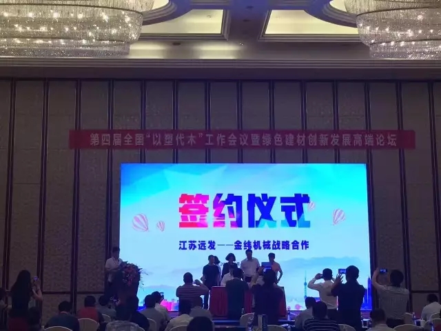 6月3日第四届全国“以塑代木”工作会议暨绿色建材创新发展高峰论坛在绿色建材名城江苏宿迁市隆重举行。在本次会议上,常州金纬片板设备制造有限公司与江苏远发新材料股份有限公司举行了战略合作的签字仪式,共同探讨建立“以塑代木”绿色建材新市场。