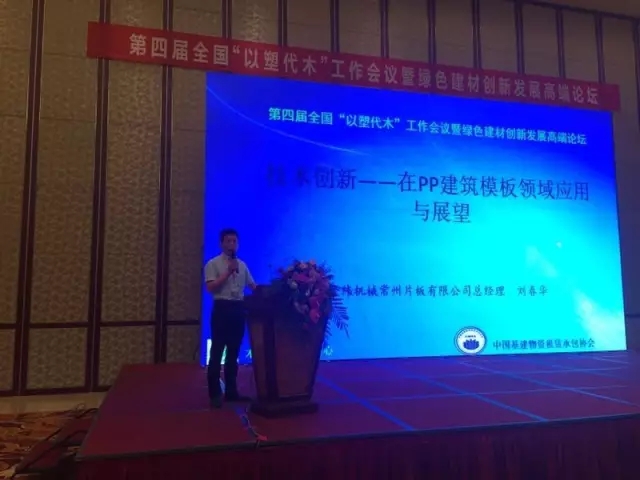 在专题报告部分,常州金纬机械片板设备制造有限公司总经理刘春华做了“技术创新--在pp建筑模板领域应用与展望”的精彩演讲。
