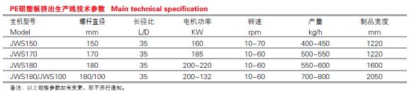 用于内、外墙装饰用PE 铝塑板生产线,制品有效宽度1220~2050mm,厚度1.0~5mm,其中铝箔厚度0.026~0.5mm,采用特