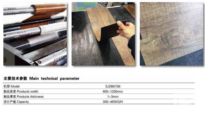 生产线由挤出机挤出地板基材,再经过一套六辊复合机对基材与印刷层,耐磨层,防滑层进行同时复合,通过对放卷张力,耐磨层预热的精确控制,达到放卷时不起皱,不收缩,不变形等效果,挤出复合生产效率高,产品质量稳定。